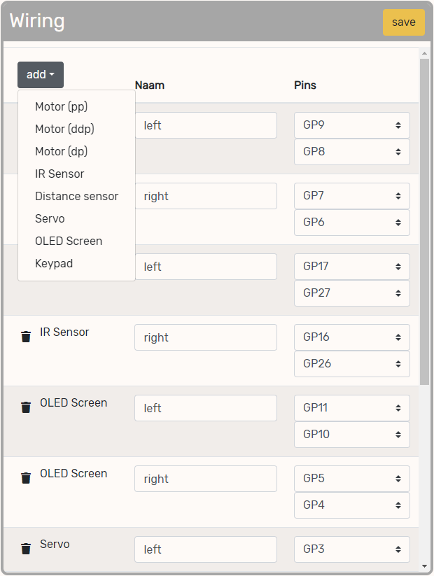 This step in only needed in case you are not using the MIRTE PCB (or followed the breadboard instructions). For other MCUs (or other wiring of the Raspberry Pi Pico) the software still needs to know which pin is connected to what kind of hardware. This can be done in two ways.