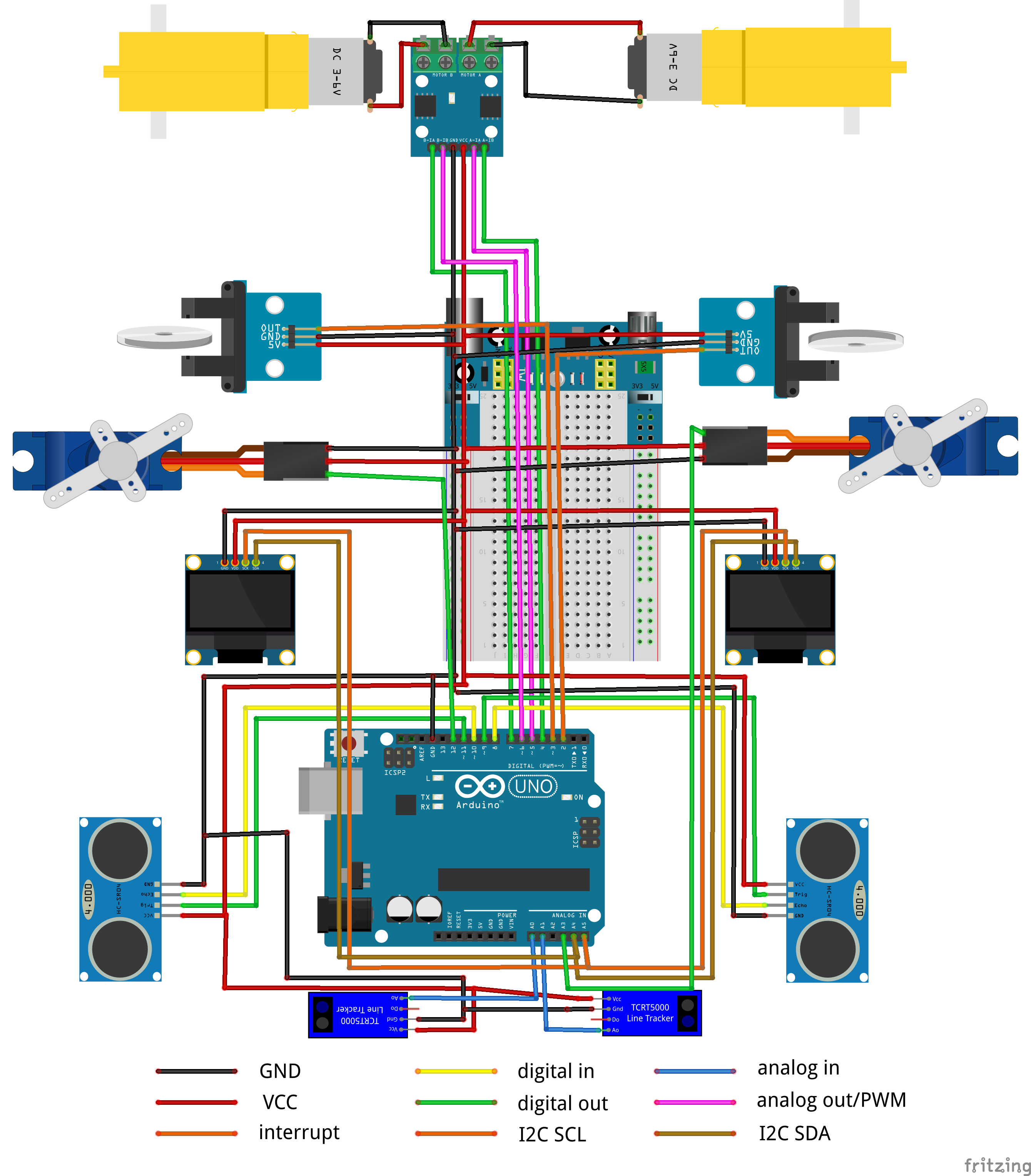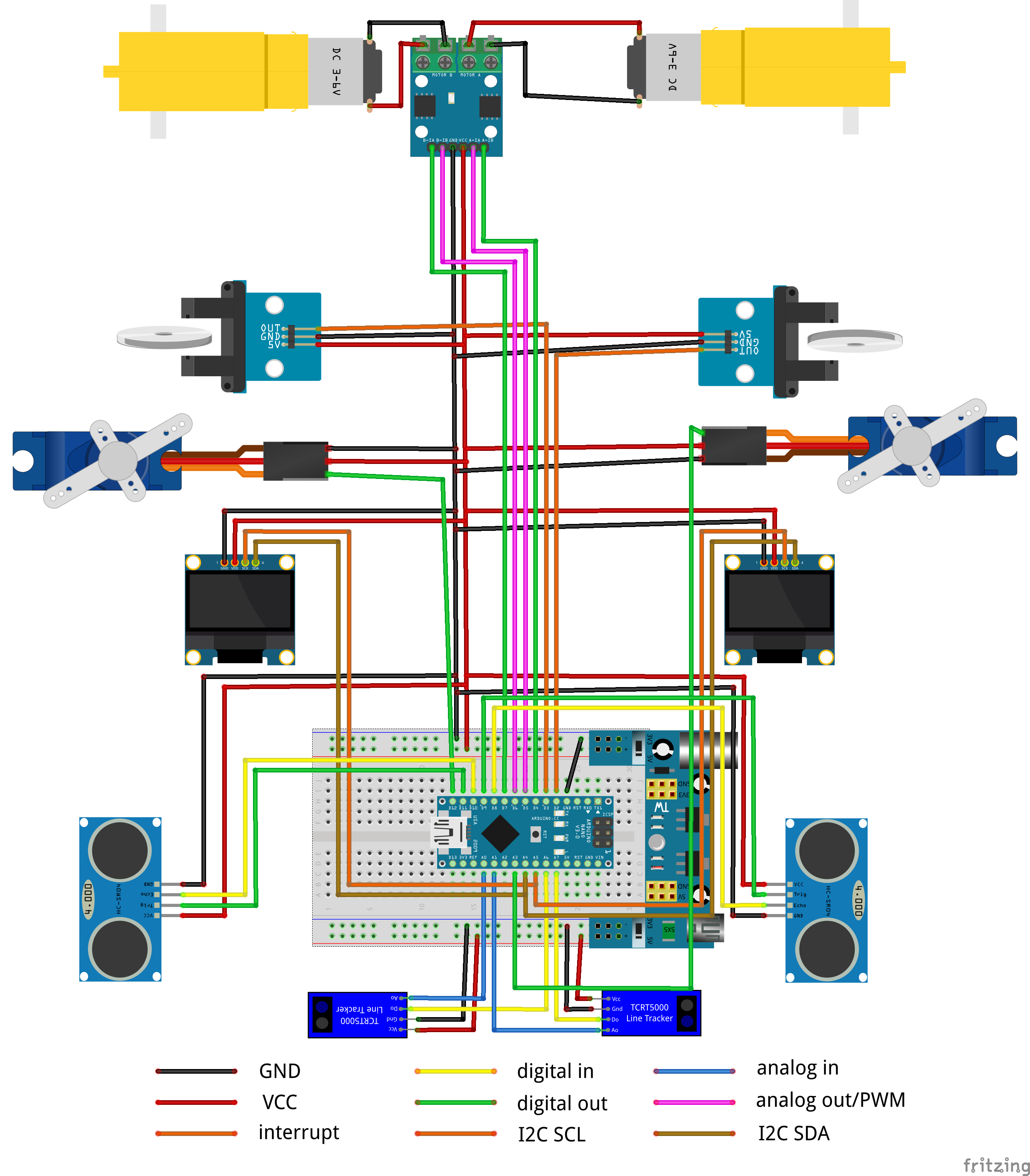 The MIRTE PCB is nothing more than just a bunch of cables on a board. You can of course also connect the same hardware to a breadboard. The fritzing image below shows you how to connect all the hardware in order to get the same pin layout as the PCB. But you are also free to chose different pins and change the configuration later on.